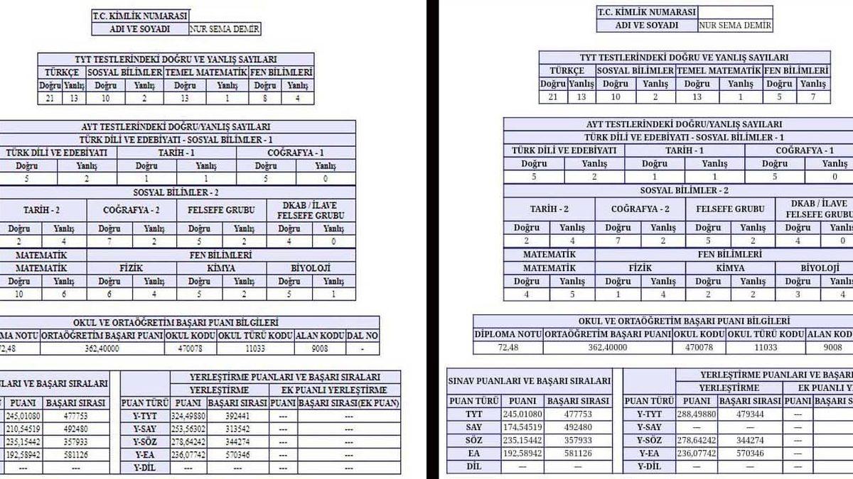 Ferit ASLAN/MARDİN, (DHA) - MARDİN'in Savur ilçesinde oturan Nur Sema Demir, 31 Temmuz'da açıklanan üniversite sınavında, sayısal bölüm sorularından 253, sözelden 278 ve temel yeterlilik testinde 324 puan aldı. Aldığı puana göre tercih yapan Demir, 1 ay sonra açıklanan yerleştirme sonucunda sayısal puanının, '0' olduğunu ve 4 yıllık bir fakülte beklerken, 18'inci tercihi olan 2 yıllık Moda Tasarımı Bölümü'ne yerleştirildiğini öğrenince şok yaşadı. Demir ailesi, ilk sınav sonucunun yerleştirme sonucundan çok farklı olduğununu, 4 yıllık bir okula yerleştirilmesini sağlayan sayısal puanın ikinci sonuç belgesinde sıfır gösterildiğini ve sonuç belgesindeki doğru ve yanlış soru sayılarının farklı olduğunu görünce ÖSYM'ye itirazda bulundu. ÖSYM tarafından Nur Sema Demir'e gönderien yanıtta, itiraz için geç kaldığı belirtildi. Demir ailesi, yapılan yanlış nedeniyle kızlarının mağdur edildiğini söyledi.