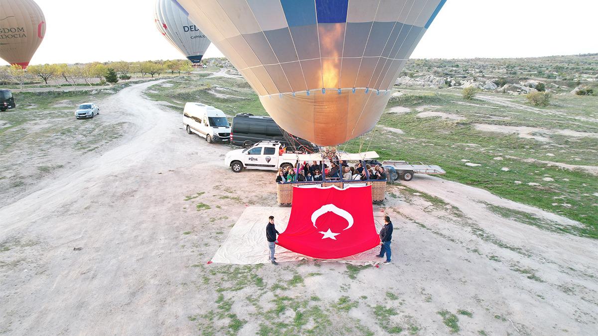 UNESCO Dünya Kültürel ve Doğal Miras Listesi'ndeki Kapadokya'da turistlerin Kapadokya'yı kuşbakışı izlemesine imkân sunan sıcak hava balonları, gün doğumundan önce tur için hazırlandı. Türkiye Büyük Millet Meclisi'nin kuruluşunun 105. yıl dönümü ve 23 Nisan Ulusal Egemenlik ve Çocuk Bayramı için görevlilerce sepetlerine Türk Bayrakları ve Atatürk posterleri asılan balonlar, güneşin yüzünü göstermesiyle peş peşe gökyüzüne havalandı.