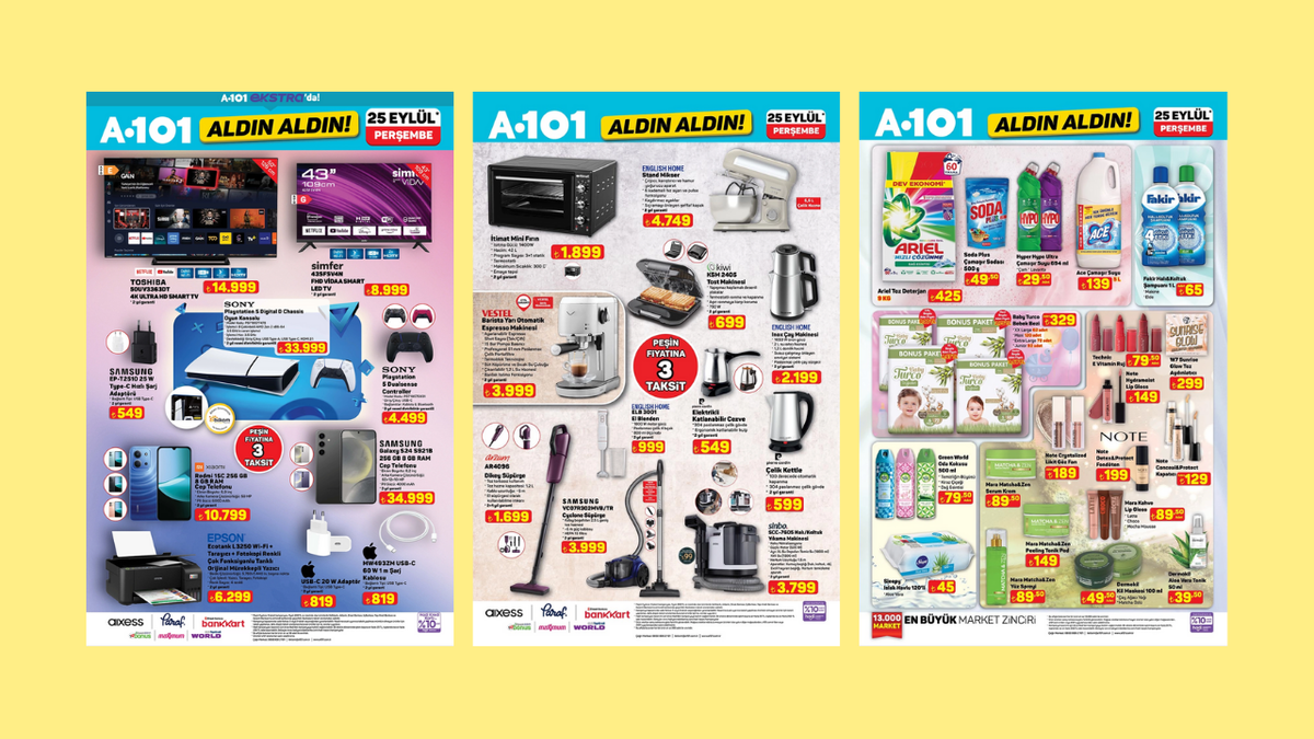 A101'in Aldın Aldın Kataloğu'nun 25 Eylül 2025 Perşembe tarihli yeni sayısı yayınladı. Alışveriş severleri her seferinde şaşırtmayı başaran A101'e şimdi de Playstaion 5 geliyor. Samsung cep telefonu, Skechers spor ayakkabılar ve Toshiba televizyon da öne çıkan diğer ürünler arasında yer alıyor. Tabii ki bununla da bitmiyor; beyaz eşyalar, kahve makinesi, valizler de kataloğu süslüyor. Bu hafta A101 aktüel kataloğunda başka neler var diye merak ediyorsanız, detaylar yazımızda...