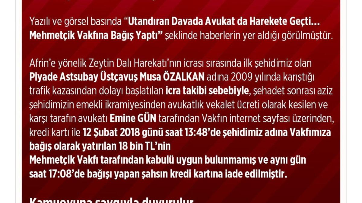 Afrin’e yönelik Zeytin Dalı Harekatı’nın icrası sırasında ilk şehidimiz olan Piyade Astsubay Üstçavuş Musa Özalkan adına 2009 yılında karıştığı trafik kazasından dolayı başlatılan icra takibi sebebiyle, şehadet sonrası aziz şehidimizin emekli ikramiyesinden avukatlık vekalet ücreti olarak kesilen ve karşı tarafın avukatı Emine Gün tarafından Vakfın internet sayfası üzerinden, kredi kartıyla 12 Şubat 2018 günü saat 13.48’de şehidimiz adına Vakfımıza bağış olarak yatırılan 18 bin TL’nin Mehmetçik Vakfı tarafından kabulü uygun bulunmamış ve aynı gün saat 18.08’de bağışı yapan şahsın kredi kartına iade edilmiştir.