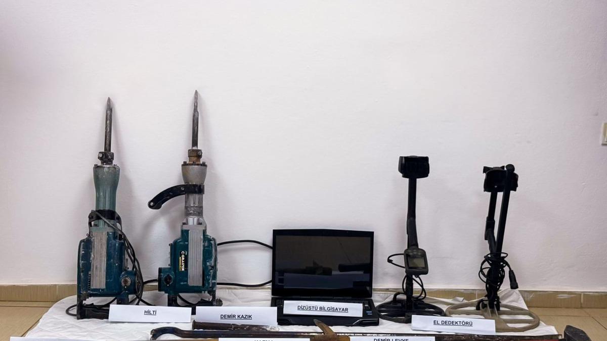 Kaçak kazı yapılan bölgede 3 dedektör, yön gösterici cihaz, dizüstü bilgisayar, kazma, kürek ve demir aparat ele geçirildi.