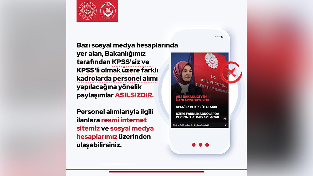 Aile ve Sosyal Hizmetler Bakanlığı sanal medya hesabından yapılan paylaşımda, “Bazı sosyal medya hesaplarında yer alan, Bakanlığımız tarafından KPSS'siz ve KPSS'li olmak üzere farklı kadrolarda personel alımı yapılacağına yönelik paylaşımlar asılsızdır. Personel alımlarıyla ilgili ilanlara resmi internet sitemiz ve sosyal medya hesaplarımız üzerinden ulaşabilirsiniz” ifadeleri kullanıldı.