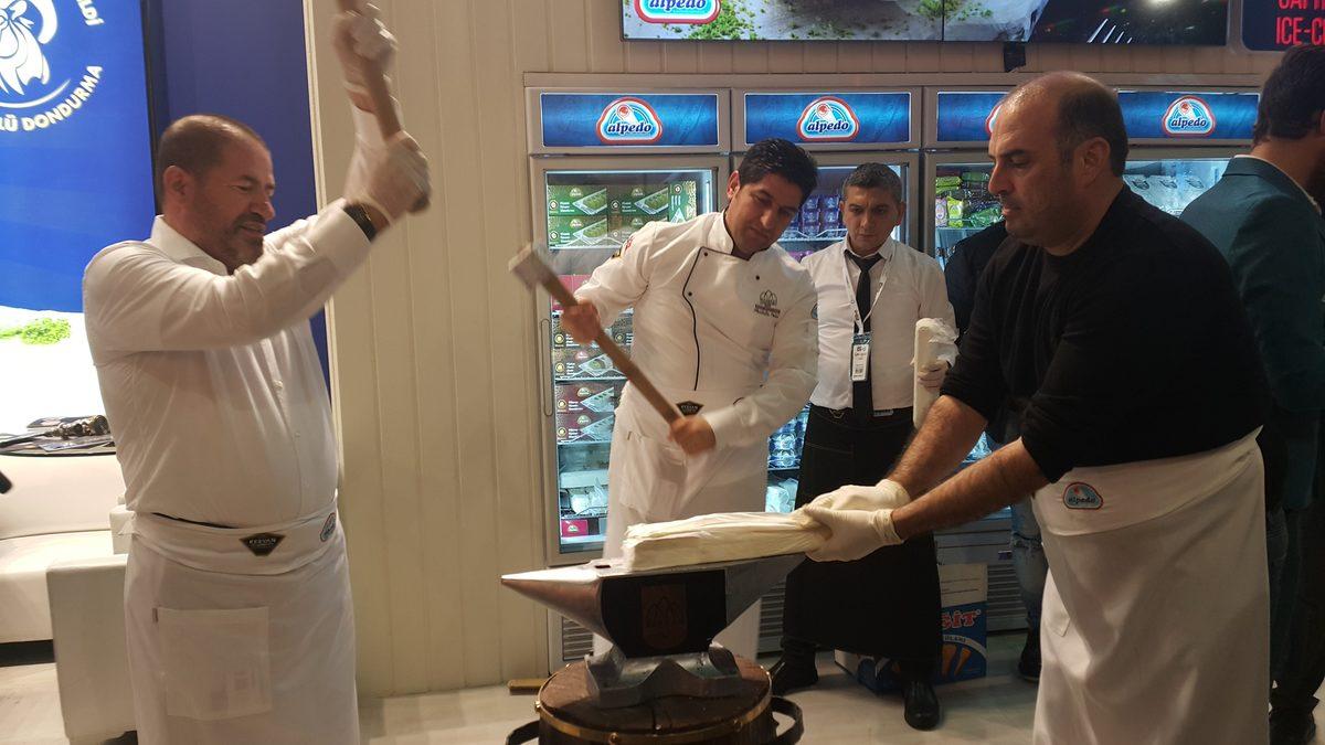 Kahramanmaraş’ın bir dondurma kenti olduğunu sözlerine ekleyen Kervancıoğlu, “Kahramanmaraş diyince akla dondurma geliyor. Bunun içeriği keçi sütü, doğal salep ve usta olması gerekiyor. Bu üçü bir araya gelince devasa bir Kahramanmaraş dondurması elde ediyorsunuz. Bu dondurmamızın servisinde çatal, bıçak ile yenmesi gerekiyor. Kaliteli ve doğal bir dondurmanın ses getirmesi lazım. Kahramanmaraş’ta bademcik ameliyatı yapıldığı zaman doktorlarımızın ilk işi reçetesine Alpedo Kahramanmaraş dondurmasını yazıyor. Ürünümüz doğal olduğu için kışın da yazın da yediğimiz zaman hiçbir zararı yoktur” dedi.
