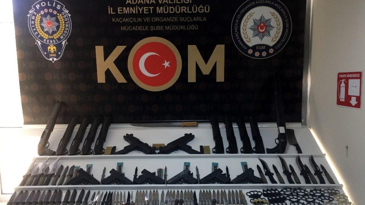 Adana merkezli 3 ilde silah kaçakçılarına yönelik yapılan operasyonda 20 ruhsatsız tabanca, 691 mermi, 67 av tüfeği, 6 uzi silahın yanı sıra 20 bin bıçak, muşta, kılıç ve kamanın ele geçirilmesi dikkat çekti.