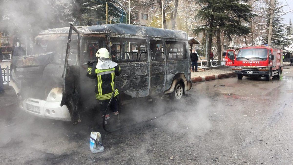 Afyonkarahisar’da şehir içi yolcu taşımacılığı yapan dolmuş seyir halindeyken lastiğinden çıkan yangın sonrası alev aldı.