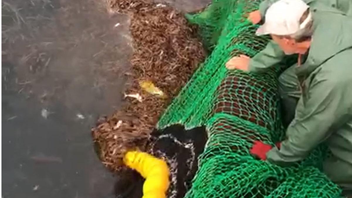 Haznede toplanmış erişte yığınının içinde sıkışıp kalan hayvan, bir süre sonra göründü. Erişteler arasından kafasını çıkaran deniz kaplumbağası, kürek biçimindeki ön ayaklarını kullanarak yüzmeyi başardı. Hızlıca ağlardan uzaklaşan deniz kaplumbağası, mavi derinliklere dalarak gözden kayboldu.