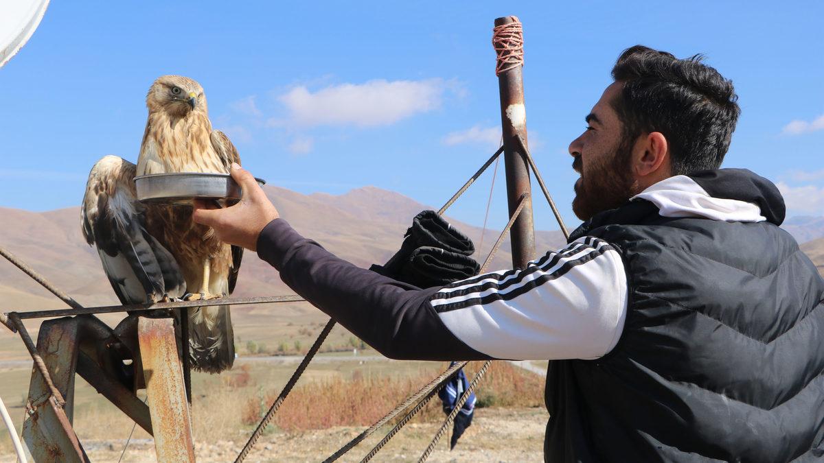 HAKKARİ"nin Yüksekova ilçesinde akıma kapılıp yaralanan kızıl şahine, bölgedeki bir şantiyenin bekçisi Harun Yalçın sahip çıktı.