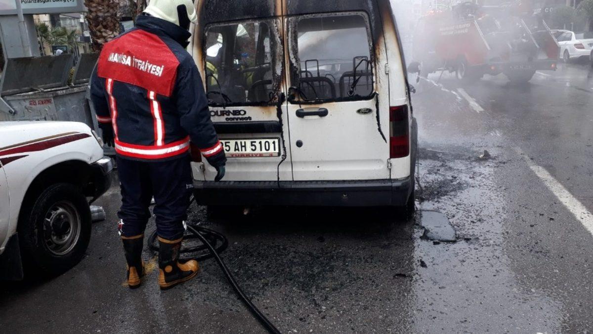 Manisa’da seyir halindeki hafif ticari aracın bir anda alev alması sonucu araç küle döndü.