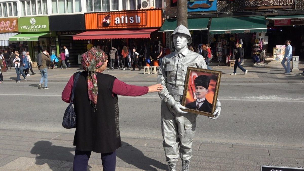 Denizli’de Atatürk’ün ebediyete intikalinin 81. yılında asker kıyafeti ile canlı heykel performansı sergileyen performans sanatçısı Emre Balım, Atatürk çerçevesi ve asker kıyafeti ile görenleri duygulandırdı.