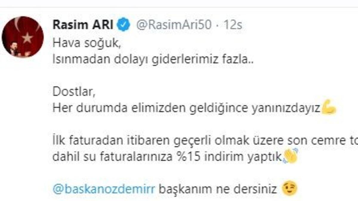 İki ilde vatandaşlara su indirimi müjdesi geldi. Sosyal medya hesaplarından birbirine çağrıda bulunan AK Partili belediye başkanları, vatandaşların yüzlerini güldürecek su indirim müjdelerini Twitter hesapları üzerinden duyurdu.
