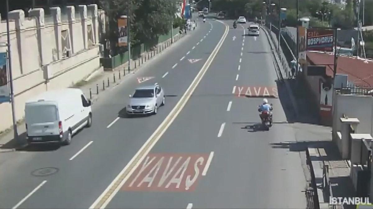 Öte yandan motosiklet sürücüsünün yaralandığı kaza güvenlik kameralarına saniye saniye yansıdı. Görüntülerde caddede dönüş yapmaya çalışan motosikletliye arkasından gelen otobüs hızla çarpıyor. Motosikletli çarpmanın etkisiyle metrelerce sürükleniyor. Motosikletli karşı şeritten gelen bir başka motosikletliye çarparak, durabiliyor.