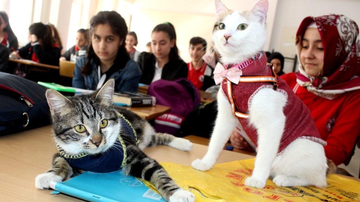 Adıyaman’da öğrencilerin gözbebeği olan okul kedisi Gofret ve Miya öğrencilerle birlikte derse giriyor.Adıyaman’da sokakta yavruyken bulunan ve okulda büyütülen Gofret ve Miya isimli iki kedi okulun maskotu oldu.
