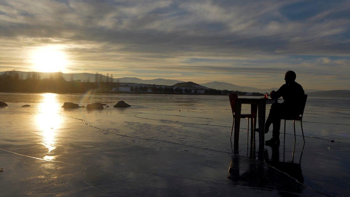 Akçakale köyünde balık lokantası işleten Turhan Kılıç da gölün buzlu halini görmeye gelen müşterilerine buz üstünde kurduğu masada çay ikramında bulundu.