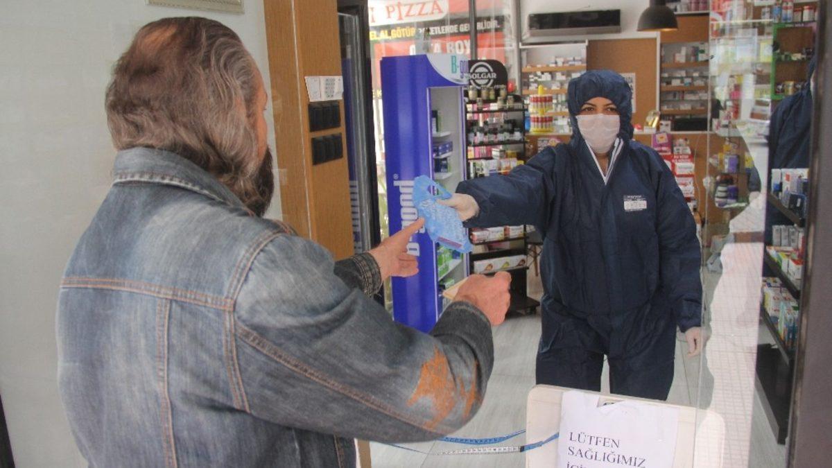 Eczanede özel kıyafetli ve güvenlik şeritli korona önlemi