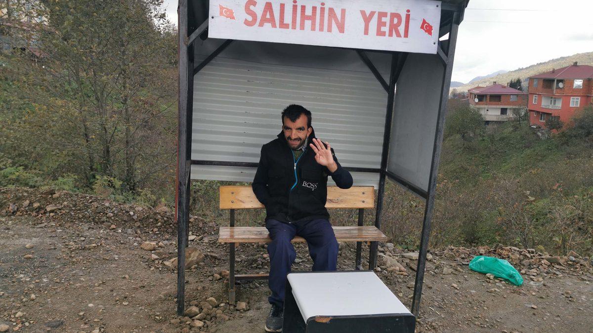 Nedim KOVAN/GÜRGENTEPE (Ordu), (DHA)- ORDU’nun Gürgentepe ilçesi Gülbelen Mahallesi’nde yoldan geçen herkese selam vermesiyle bilinen engelli Salih Belen (27), ıslanmaması için kaymakamlık tarafından kendisine özel yaptırılan bekleme durağının sevincini yaşıyor. Araçlarıyla yoldan geçen vatandaşlar, durağın yanında durup kendilerini selamlayan Belen ile fotoğraf çektirip, selfie yapıyor.
