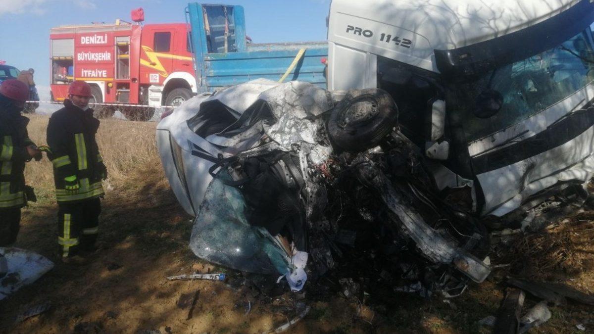 Denizli’de traktörü sollamak isteyen tırın, karşı şeritten gelen otomobille kafa kafaya çarpıştığı kazada 1 kişi öldü, 1 kişi ağır yaralandı.