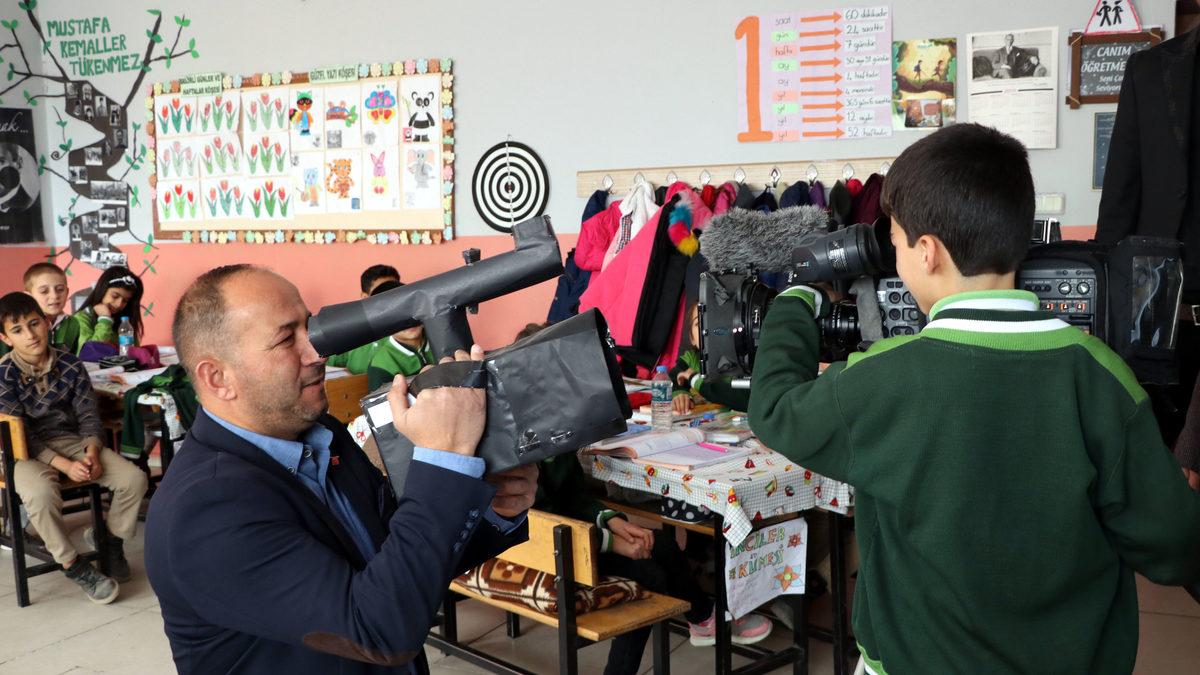 Behçet DALMAZ- Orhan AŞAN/VAN, (DHA)- TÜRKİYE Haber Kameramanları Derneği Başkanı Aytekin Polatel ve beraberindeki yönetim kurulu üyeleri, Van'ın Tuşba ilçesindeki Akköprü İlkokulu'nda eğitim gören ve kameramanlık hayalini kartondan kamera yaparak gerçekleştiren 4'üncü sınıf öğrencisi Abdulselam Arslan'ı (11) okulunda ziyaret etti, kamera eğitimi verdi. Çok mutlu olan Abdulselam ve öğretmeni Hulusi Çakır, Başkan Polatel ile Kültür ve Turizm Bakanlığı'nın davetlisi olarak Ankara'ya gidecek.
