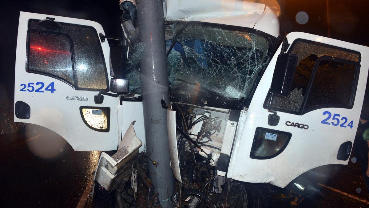 KAHRAMANARAŞ'ta, kontrolden çıkan kamyon tabela direğine çarptı.