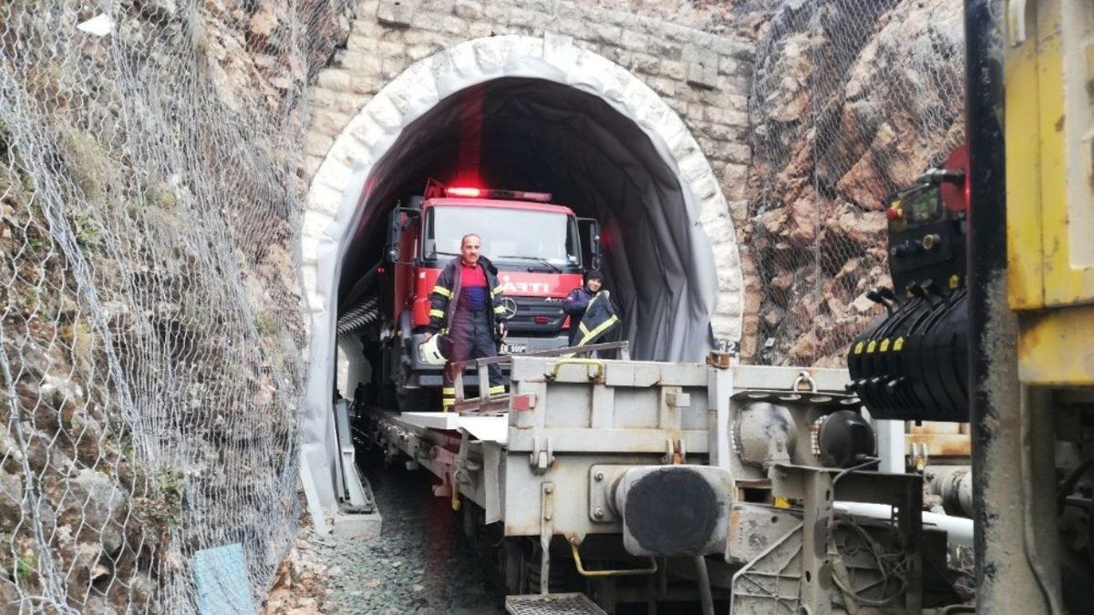 Amasya-Tokat sınırında bir tünelde çıkan yangına müdahale etmeye çalışan itfaiye aracı karayolu ile gidilemeyen bölgeye vagonun üstünde demiryolundan ulaştı.