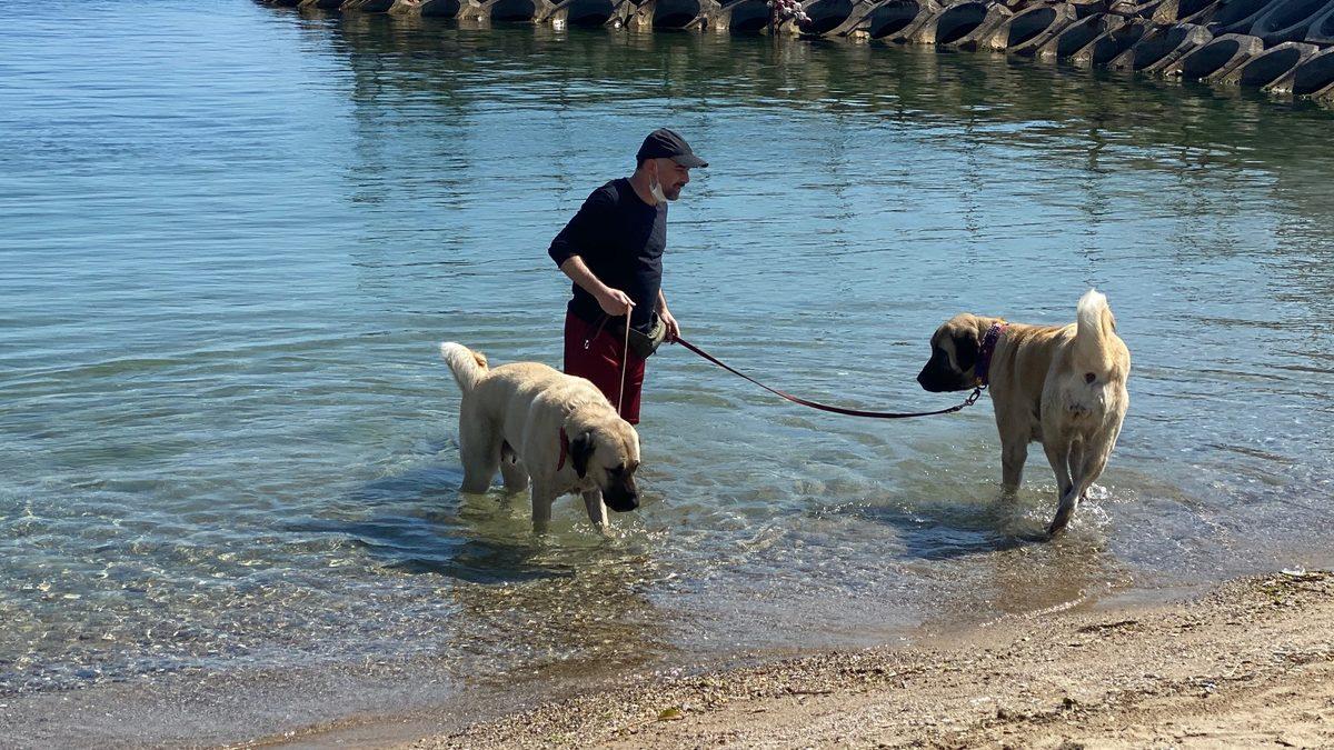 Kadıköy'de iki Anadolu çoban köpeği, sahibinin kaymakamlıktan aldığı 2 saatlik özel izinle dışarı çıktı. Uzun süredir evde olan köpekler, Caddebostan Plajı'nda denize girerek gönüllerince vakit geçirdi.