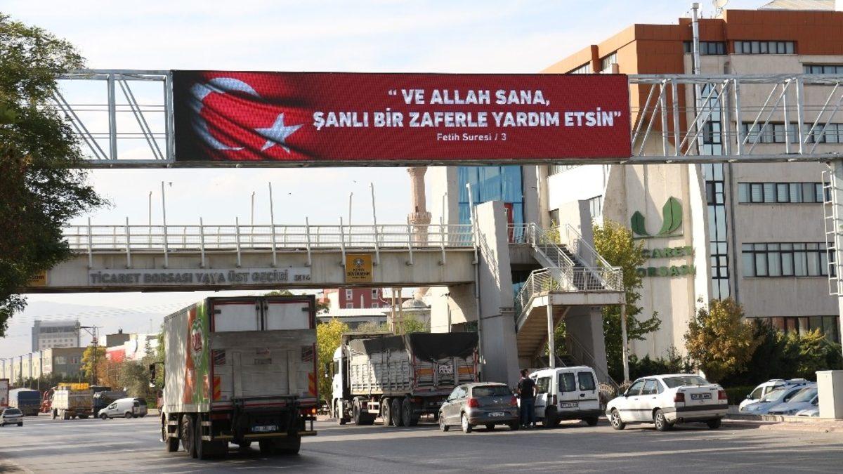 Konya’da birçok noktada bulunan elektronik yön ve bilgilendirme levhalarına Fetih Suresi’nin 3. ayeti yazılarak Barış Pınarı Harekatı’na katılan Mehmetçiğe destek mesajı verildi.