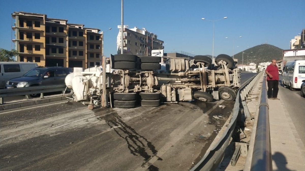 Kuşadası çevre yolunda kontrolden çıkarak devrilen beton mikseri 150 metre sürüklendikten sonra durabildi.