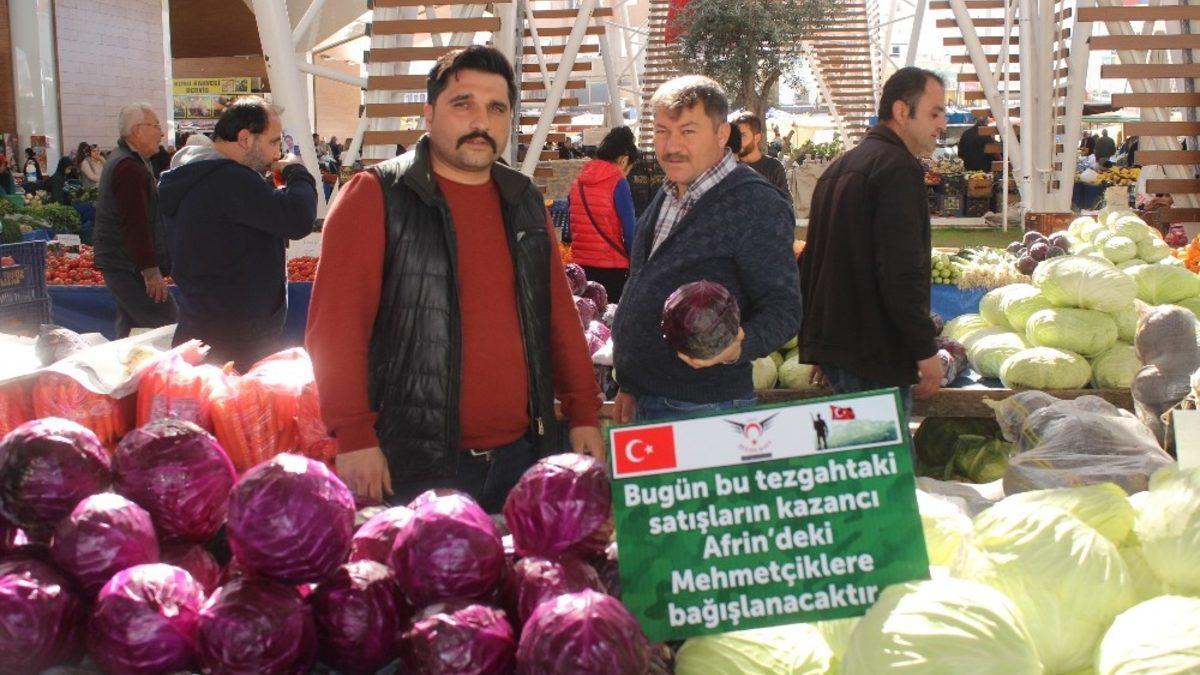 Antalya’nın Manavgat ilçesinde pazar esnafı “Bugün bu tezgahtaki satışların kazancı Afrin’deki Mehmetçiklere bağışlanacak” yazılı tabelalarla tezgah açtı.