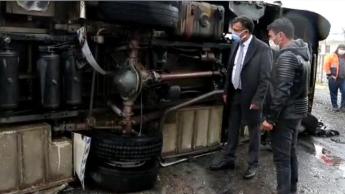 Manisa’nın Alaşehir ilçesinde seyir halindeyken lastiği patlayan işçi servisinin yola devrilmesi sonrası minibüs alev aldı.