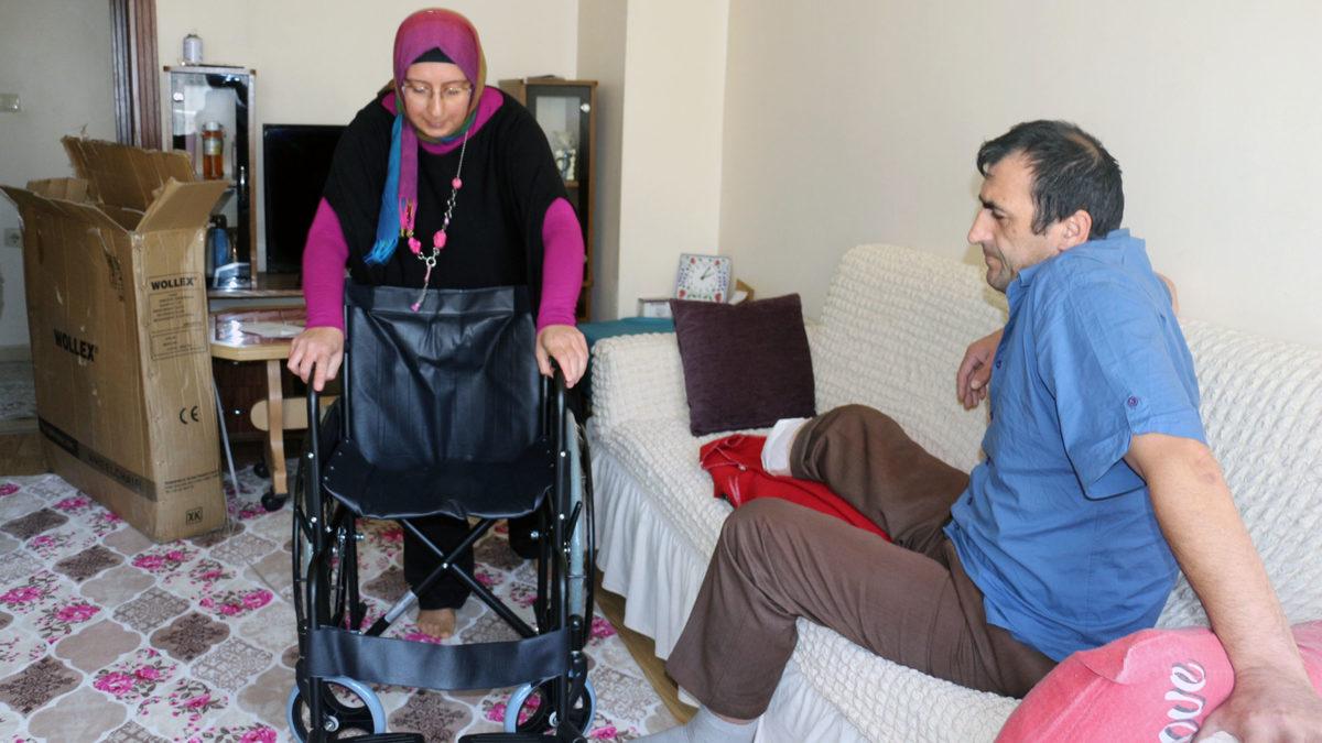 Ramazan SARICI/ÇANKIRI, (DHA) - ÇANKIRI'da ayağı kırılan annesi Elif Şen'i (59) tedavi sürecinde tekerlekli sandalye olmadığı için hastaneye götürmekte sıkıntı yaşayan ve daha sonra mavi kapak toplayarak ihtiyaç sahiplerine tekerlekli sandalye ulaştırmaya başlayan Belma Şen (38), 3'üncü tekerlekli sandalyesini İsmail Yaman'a (44) hediye etti.