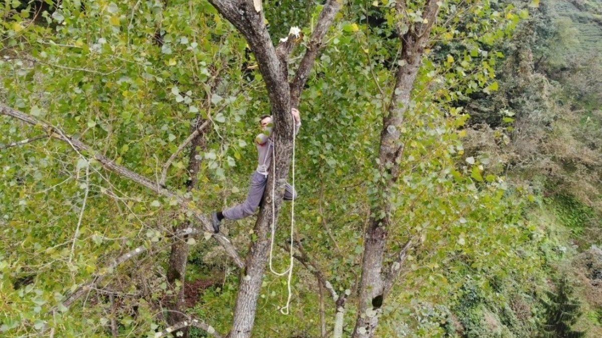 Trabzon’un Araklı ilçesinde hiçbir tırmanma aparatı kullanmadan metrelerce yükseklikteki ağaçlarda budama yapan Sinan Danışmaz, görenlerin yüreklerini ağza getiriyor.
