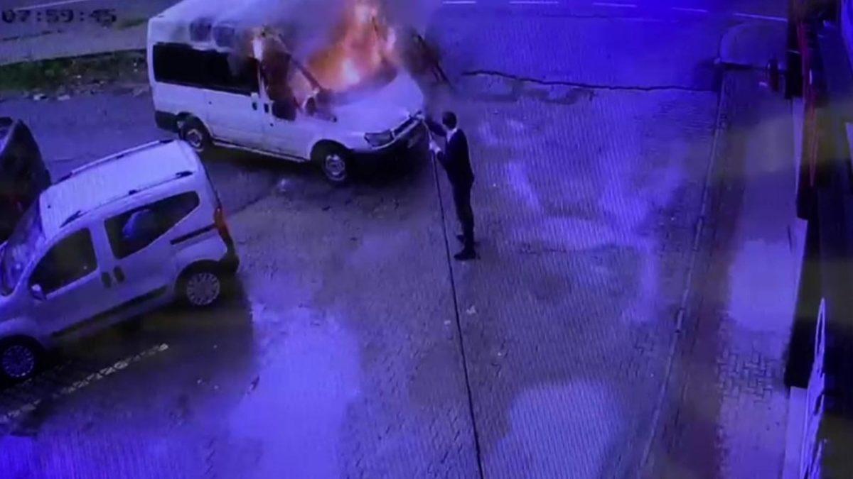 Rizeli esnaf park halindeyken alev alan minibüsü söndürmek için seferber oldu