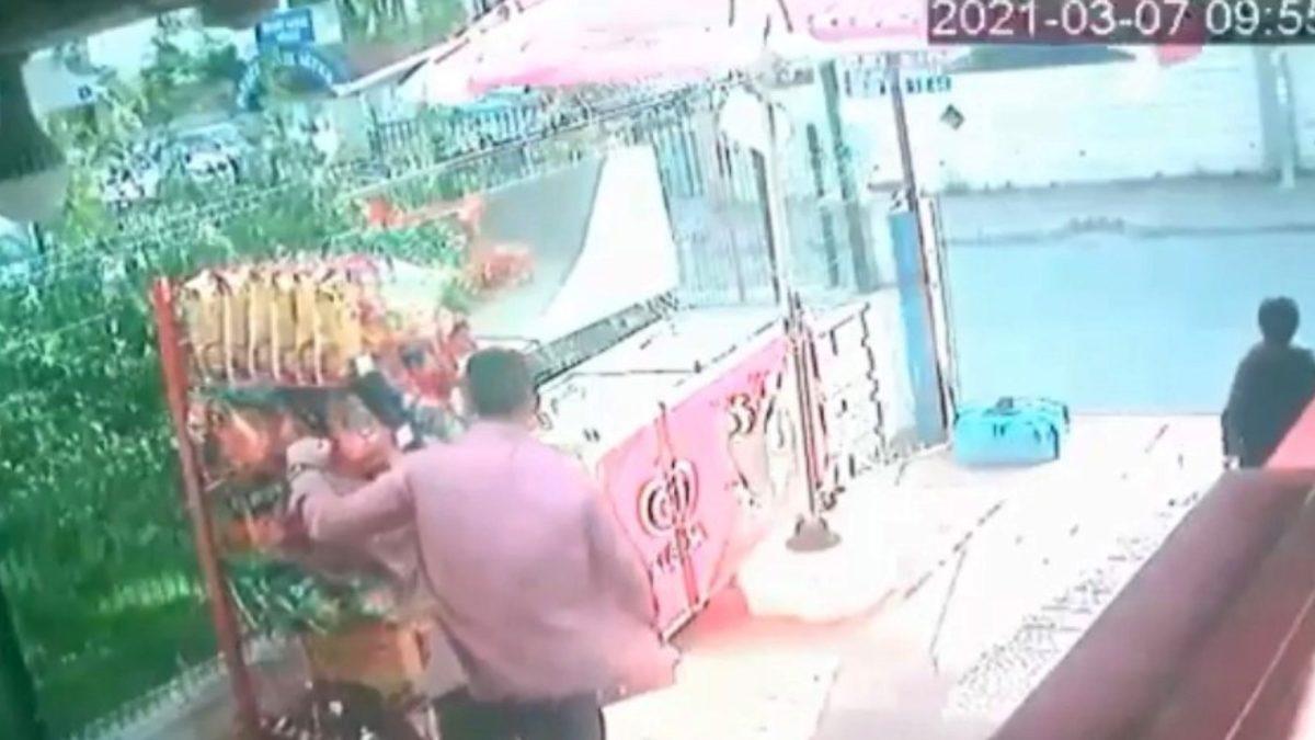 Rüzgarla ilerleyen cips standının peşine taktığı marketçiye hırsız şoku