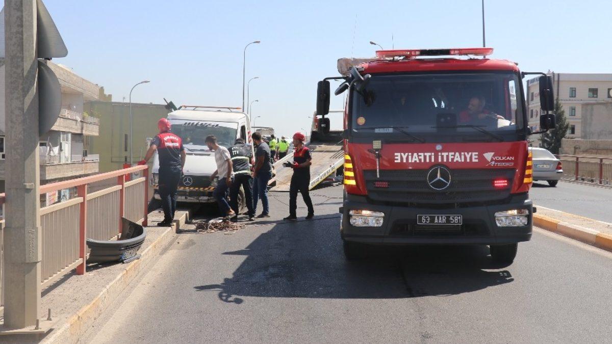 Şanlıurfa’da aynı yönde seyreden iki aracın çarpışması sonucu meydana gelen trafik kazasında kamyonet köprüde asılı kaldı.