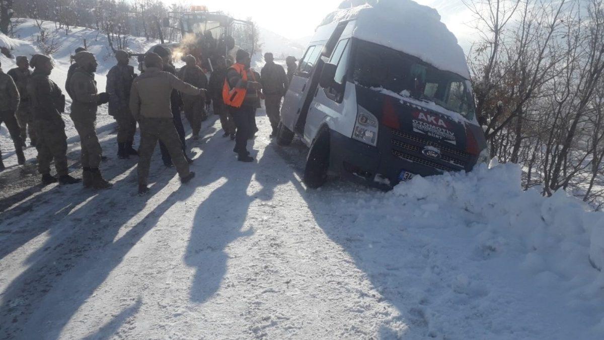 Edinilen bilgiye göre, Siirt’in Şirvan ilçesine bağlı Elmadalı köy yolunda kar nedeniyle güvenlik korucularını taşıyan minibüs kaydı. Kayan minibüs, şarampol kenarında durdu. Minibüsten inen güvenlik korucuları durumu Karayolları 94. Siirt Şube Şefliğine bildirdi. Bölgeye sevk edilen ekipler, korucuların da yardımıyla minibüsü, iş makinesine bağlanan halat yardımıyla bulunduğu yerden kurtardı.