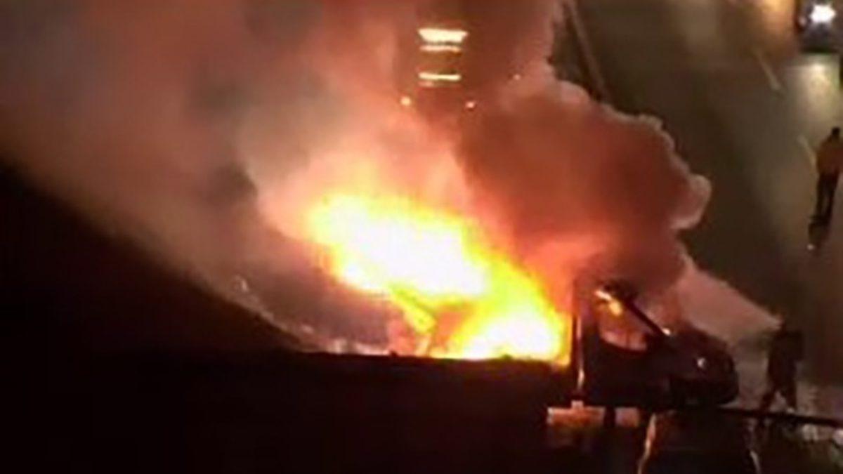 TEM otoyolunda maske yüklü kamyonetin alev alev yandığı anlar kamerada