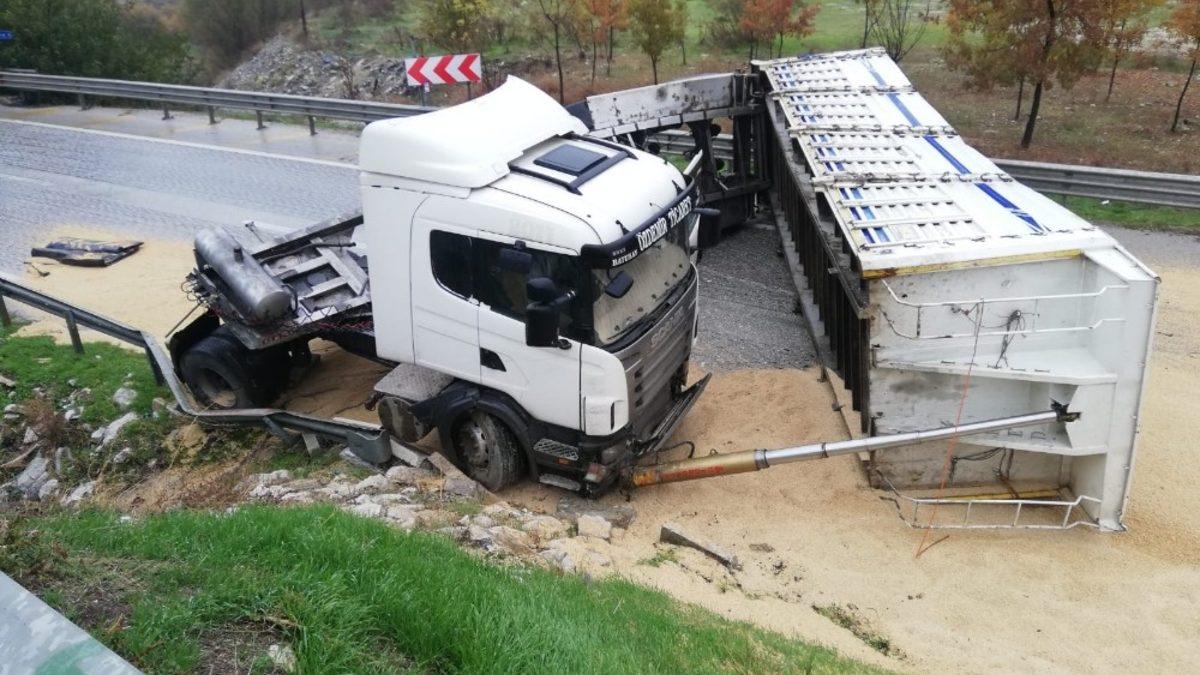Manisa’nın Kula ilçesinde buğday yüklü tır, yağışlı havanın etkisiyle kayganlaşan yolda kontrolden çıkarak devrildi.