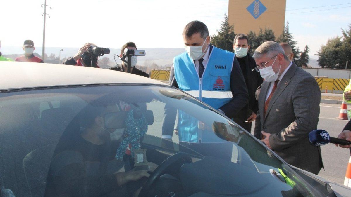 Kontrol noktasında durdurulan araçlardaki sürücülerle sohbet eden Vali Çiftçi ve Başkan Aşgın, yeni yılını kutladığı sürücülerden hem pandemi hem de trafik kurallarına uymaları için çağrıda bulundular.