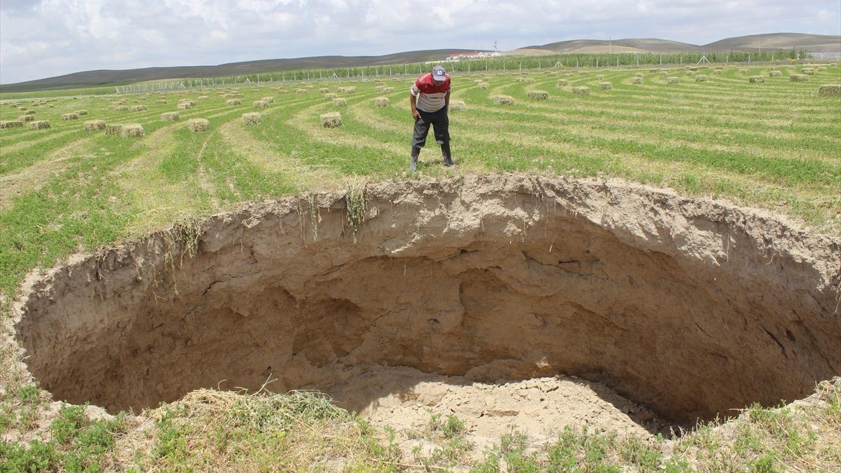 Konya'nın Karapınar ilçesinde yonca ekili tarlada bir anda 7 metre çapında ve 10 metre derinliğinde bir obruk oluştu. Oluşan obruğun yakınındaki buğday tarlasında çalışan Latif Karakaya, "Yıldırım düşmüş gibi bir ses geldi, bir baktık obruk olmuş" diye konuştu.
