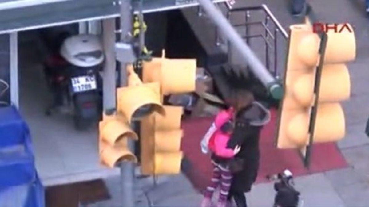 Harbiye'de, gaz bombası atan polisler ile havai fişek atan grubun arasında kalan eli poşetli bir anne, küçük yaştaki kız çocuğunu kucağına alarak koşar adımlarla olay yerinden uzaklaşmaya başladı.