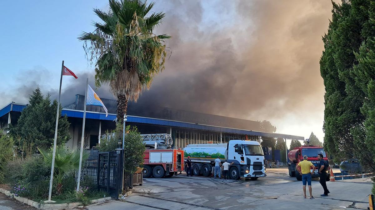Antalya'nın Serik ilçesinde soğuk hava deposu ve bitişiğindeki imalathanede yangın çıktı. Bölgeye sevk edilen ekipler, alevlere müdahale ediyor.