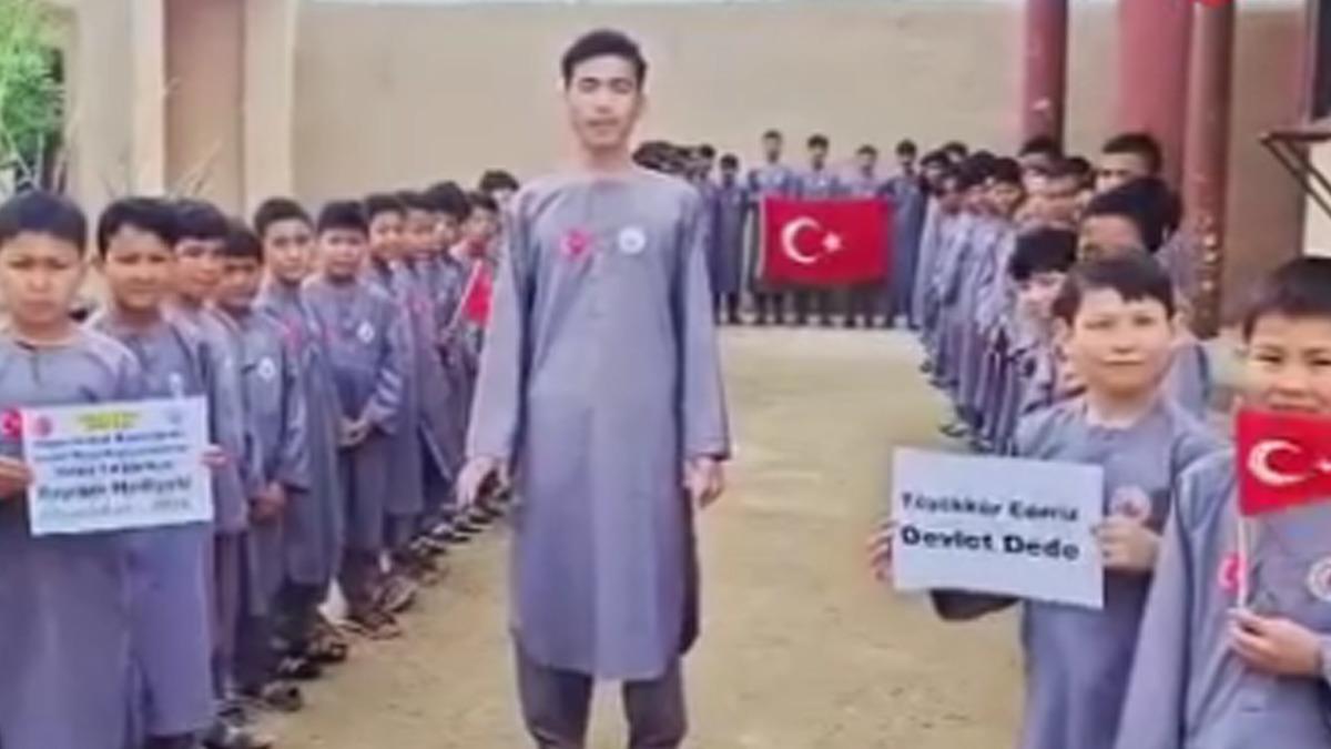MHP lideri Bahçeli’nin Afganistan’da bulunan, Andhoy Türkmen Evi Talebe Yurdunda eğitim gören yetim çocuklara, Bayram öncesi göndermiş olduğu temel ihtiyaçları ve kıyafetleri için, Andhoy da eğitim gören yetim çocuklar, MHP lideri Bahçeli’ye teşekkürlerini ifade ederek, "Teşekkür ederiz Devlet dede" diyerek sevinçlerini dile getiren bir video paylaştı.