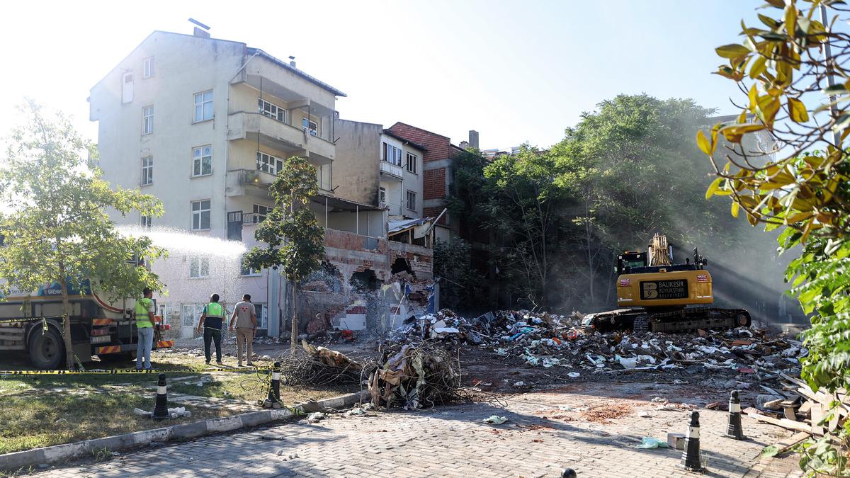 Balıkesir'deki depremde yıkılan binanın enkazı kaldırılıyor