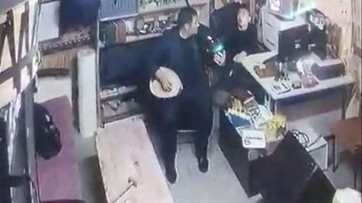 Kayseri’de müzik aletleri sattığı iş yerinde saz çalan Ali Yıldız, notalara bastığı sırada kafasına düşen saz ile neye uğradığını şaşırdı. Ali Yıldız’ın saz çaldığı sırada kafasına sazın düştüğü an iş yerinin güvenlik kamerasınca saniye saniye görüntülendi.
