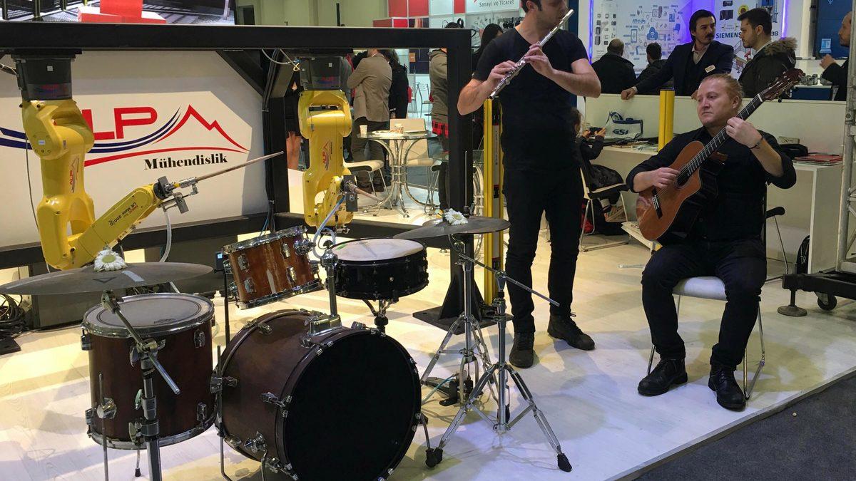 Hande NAYMAN/İZMİR, (DHA)- İZMİR'de devam eden FIT'19 Geleceğin Endüstriyel Teknolojileri Fuarı kapsamında bir teknoloji firmasının şov amaçlı ürettiği bateri çalan robot ilgi gördü. Gitar ve yan flüt çalan müzisyenlerle birlikte konser veren robot, izleyenlerin yüzünde tebessüm oluşturdu.