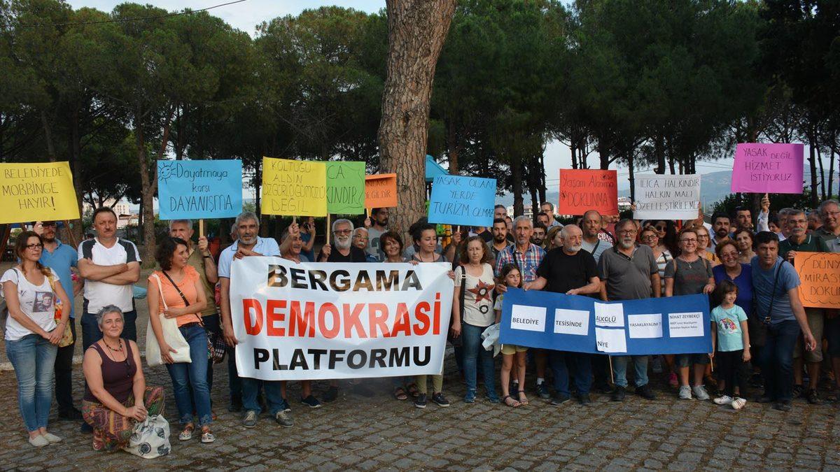 Bergama Demokrasi Platformu Dönem Sözcüsü Sevilay Parlas tarafından okunan basın açıklamasında ise "Bergama Belediyesi'nde yönetimin mazbatayı almasıyla birlikte çalışanlara özellikle de belediyede örgütlü ve yetkili sendika üyelerine baskı başladı. Sosyal demokrat, ilerici, Alevi kimlikleriyle bilinen çalışanların görev yerleri değiştirildi" denildi.