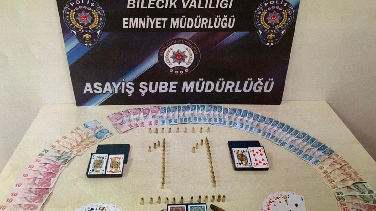 Alınan bilgilere göre; Bilecik İl Emniyet Müdürlüğü Asayiş Şube Müdürlüğü görevlilerince yapılan çalışma neticesinde il merkezinde faaliyet gösteren bir iş yerinde bulunan dairede kumar oynatıldığı bilgisine ulaştı. Asayiş ekipleri mahkeme kararı ile bahse konu adrese baskın yaparken, içeride bulunan 9 kişi gözaltına aldı. Şahısların üstlerinde ve iş yerinde yapılan aramada 4 bin 930 TL para, 50 adet 9 mm fişek, 1 adet tahta işlemeli bıçak, 3 kutu açılmamış iskambil kağıdı, 104 adet açılmamış iskambil kağıdı ele geçirdi. Şahıslara kabahatler kanunu 34’üncü maddesinden toplamda 12 bin 24 TL cezai işlem uygulandı. Ayrıca bahse konu adreste Bilecik İl Hıfzıssıhha Kanunu gereğince gerekli idari işlem yapılacağı öğrenildi.