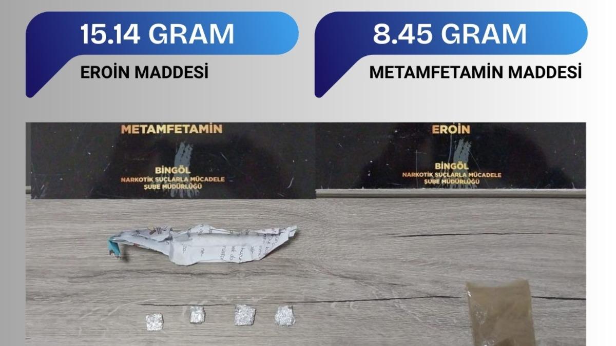 Bingöl İl Emniyet Müdürlüğü Narkotik Suçlarla Mücadele Şube Müdürlüğü ekipleri, uyuşturucuyla mücadele çalışmalarını sürdürüyor. Bu çerçevede düzenlenen 2 ayrı operasyonda 15,14 gram eroin, 8,45 gram metamfetamin ve 96,75 gram esrar maddesi ele geçirildi. Operasyonda gözaltına alınan ve işlemlerinin ardından adliyeye sevk edilen şüphelinin "Uyuşturucu Madde Ticareti" suçundan tutuklanarak cezaevine gönderildiği bildirildi.