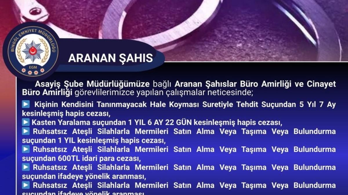 Bingöl İl Emniyet Müdürlüğü, aranan şüphelilerin yakalanması için çalışmalarını sürdürüyor. Bu çerçevede, yapılan çalışmalarda 6 farklı olaydan suç kaydı ve ‘Kasten Yaralama, Ruhsatsız Ateşli Silahlarla Mermileri Satın Alma veya Taşıma veya Bulundurma, Tehdit" suçlarından 8 yıl 1 ay 22 gün kesinleşmiş hapis cezası bulunan şahıs yakalandı. Şahıs, işlemlerinin ardından cezaevine gönderildi. (İHA)