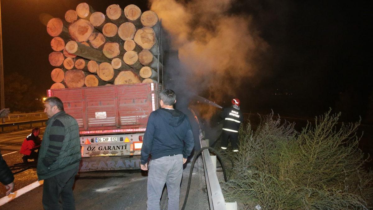 Bolu'da tomruk yüklü tırın dorsesinde çıkan yangın söndürüldü