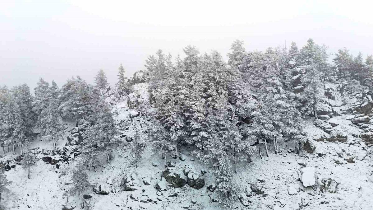 Sabah saatlerinden itibaren etkili olan kar yağışı sebebiyle yeşil alanlarda kar kalınlığı 5 santimetrenin üzerine çıktı. Beyaz örtüyle kaplanan Kartalkaya bölgesi havadan dronla görüntülendi.